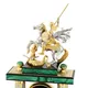 Каждая деталь часов выполнена с исключительным вниманием к деталям. Фигура Святого Георгия Победоносеца, отлитая из бронзы, покоится на постаменте из натурального долерита, шпонированного благородным малахитом (известным своим происхождением из Конго) и латуни, безупречно покрытой золотом (20 мкм высшей пробы) и искусно украшенной ручной гравировкой.
